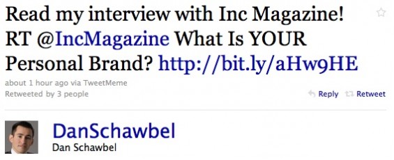 Of course, depending on your occupation or what you tweet some people may expect a certain extent of self-promotion. After all, if you’re a blogger or journalist for a specific news org, there’s a good chance that people follow you because of what you write. Some people will distinguish these tweets with a “New Post:” at the beginning. Again, not saying don’t do it at all, but just watch how often you’re doing it. If you over do it, you’ll drive people away. This example below is okay to do from Dan Schawbel, but the key is to not do it excessively.